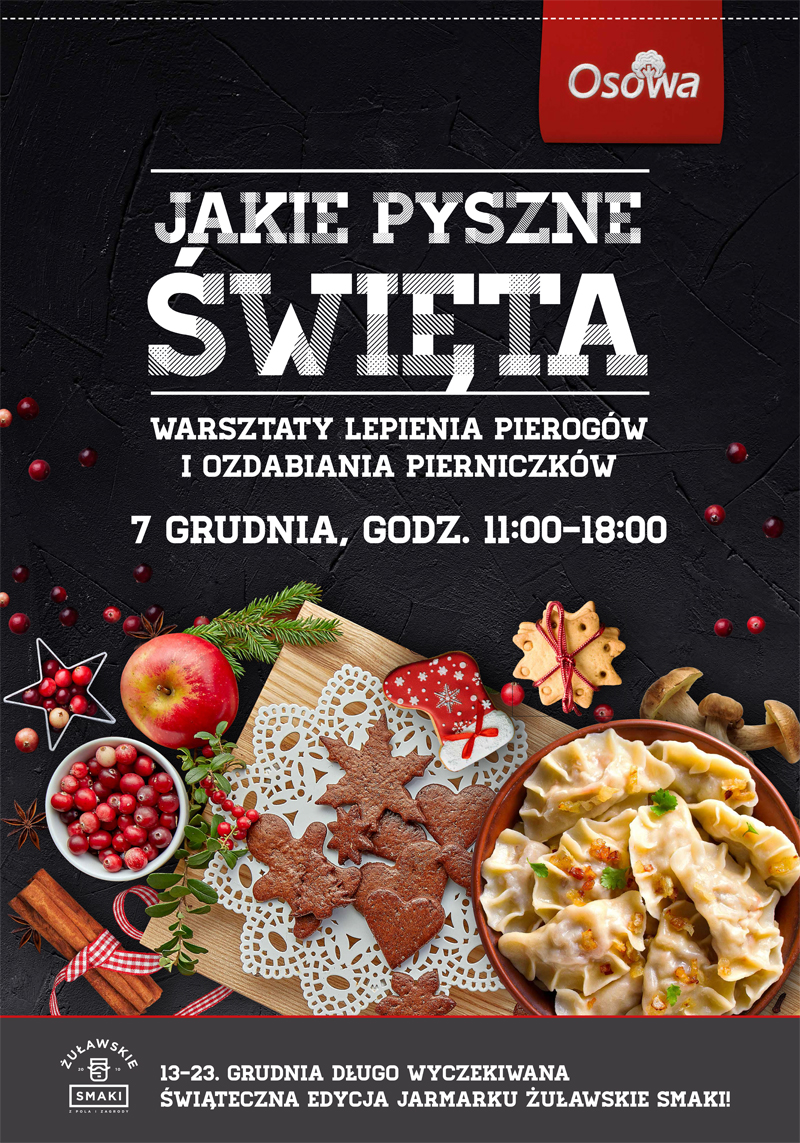 7 grudnia przewidziana jest wyjątkowa atrakcja – warsztaty z lepienia pierogów i pieczenia pierniczków – organizowane przez Żuławskie Smaki! Będziecie mogli nauczyć się jak robić prawdziwe pierniczki – od wałkowania ciasta, przez wypiek, zdobienie a nawet ozdobne zapakowanie na prezent oraz jak ulepić najznakomitsze pierogi.